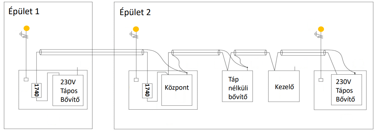 Az ATS1740 modulokkal izolált szakaszoknak külön-külön tápellátásra van szükségük. Két épület közötti külső szakasz komplex izolálásához 2 db ATS1740 modulra van szükség, egymással szembefordítva