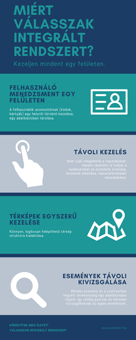 Az integrált rendszer akkor válik teljessé, ha a behatolásjelző, tűzjelző, videó és grafikus megjelenítő rendszernek a beléptető rendszer is a részévé válik. Ne kelljen külön szoftvert használni az állandó és vendég felhasználók adatainak, kártyáinak és jogosultságainak menedzselésére. Mindemellett az is fontos szempont, hogy az egyes ajtók, sorompók és kapuk a grafikus megjelenítő szoftverből is nyithatóak legyenek, valamint itt is egyszerűen ki lehessen választani az adott áthaladási ponthoz tartozó kamera képeket. Az a tapasztalatom, hogy mindig a beléptető rendszer integrálása a legösszetettebb feladat, nagyon sok grafikus megjelenítő szoftver nem, vagy csak korlátozott mértékben teszi lehetővé beléptető rendszerek használatát. Erre mindig figyeljünk az integrált rendszer kiválasztásánál.