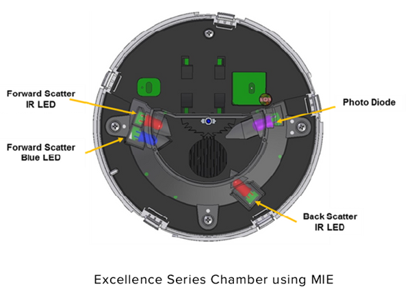 Azonban nem ez az egyetlen újdonság az Excellence érzékelő családban. Maga az érzékelő kamra is úgy lett megtervezve, hogy minél ellenállóbb legyen a por bejutásával szemben. A kamra kialakítása vertikális, a levegő alulról felfelé áramlik a kamrában, nem oldalirányban. Emellett a kamra elektrosztatikusan fel van töltve, hogy taszítsa a port. Ezekből adódóan a por gyakorlatilag nem tud megtapadni a kamrában. Vagyis az érzékelők normál körülmények között nem igényelnek karbantartást a szennyezettségre vonatkozóan!