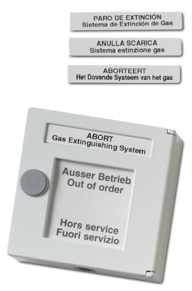 Hagyományos kézi jelzésadó kit, FEHÉR "EXTINGUISHING ABORT" felirattal, visszaállítható műanyag betétes, a kit tartalmazza a nyomógombi előlapot és átlátszó takarófedelet, hátsó burkolat tartozék
