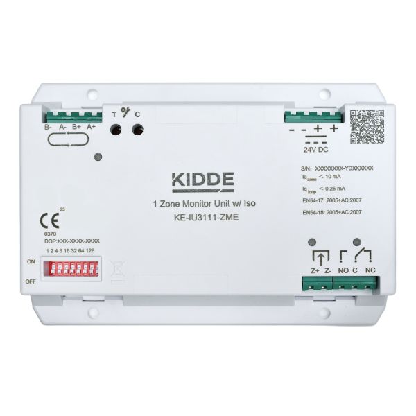 Kidde Excellence hagyományos zóna illesztő modul, analóg-címzett tűzjelző központokhoz (2X-A v5.0-tól), külső tápellátás szükséges, beépített izolátor (negatív megszakítás), lokál teszt funkció, DIP kapcsolós címzés, DIN sínre szerelhető, opcionális doboz, áramfelvétel 15 mA (nyugalmi) / 40 mA (aktiváláskor), -22 °C és +55 °C közötti működés, IP30