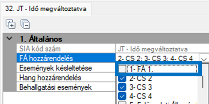 Például lehetőség, ha nem szeretnénk azt, hogy a központ eljelentse a távfelügyelet felé a dátum/idő módosításokat, akkor a 32. JT. Idő megváltoztatva eseménynél az FA hozzárendelés opciónál kivesszük az adott felügyeleti állomás mellől a pipát.