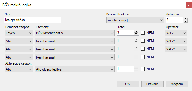 A négy ajtós bővítő kimenetével kell vezérelni egy makrót, ami letiltja / engedélyezi a megadott számú ajtó olvasóit: