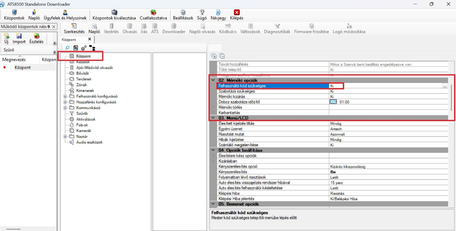 - Központ / 02. Mérnöki opciók / Felhasználói kód szükséges = Ki