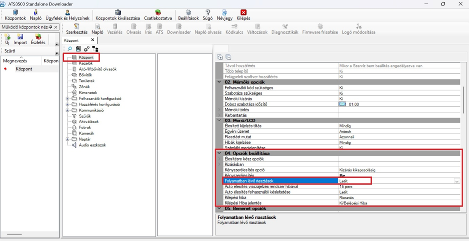 - Központ / 04. Opciók beállítása / Folyamatban levő riasztások = Letilt