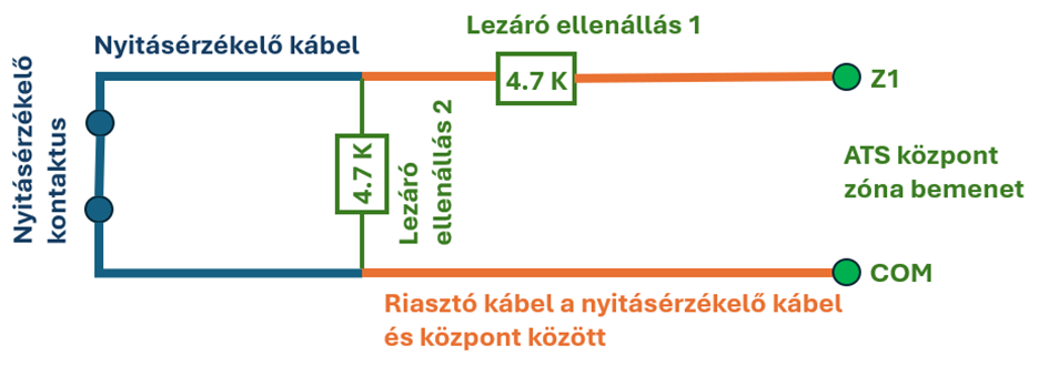 Ha az ajtó (nyitásérzékelő kontaktus) zárva van Normál állapot 4.7 K ellenállás