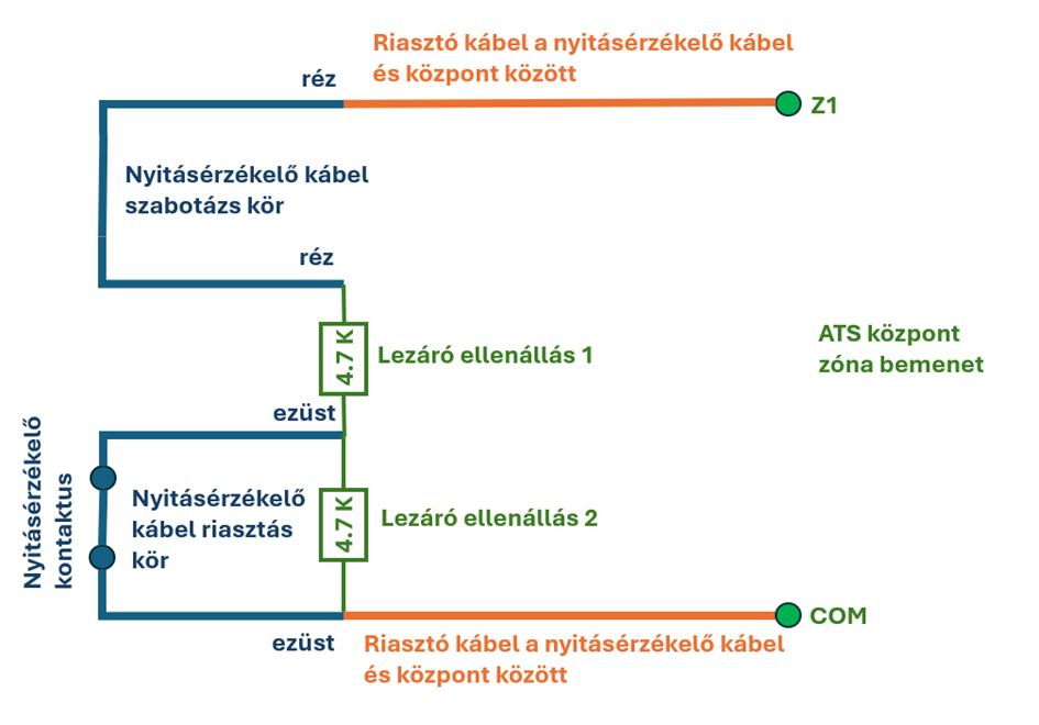 A központon a Z1 és COM között a következő ellenállás értékek mérhetőek, a nyitásérzékelő és a riasztó kábel állapotától függően: