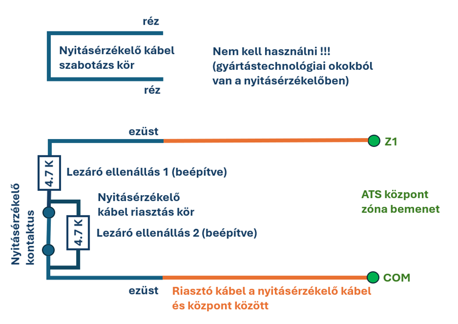 Ritka, de ez esetben a nagyobb biztonsági szint egyszerűséggel is jár. Beépített ellenállás esetén egyrészt nem nekünk kell időt töltenünk az ellenállások bekötésével (mivel azokat tartalmazza a nyitásérzékelő), másrészt pedig csak a nyitásérzékelő riasztás körét (’ezüst’ kábelek) kell használni. A nyitásérzékelő kábel szabotázs körének (’réz’ kábelek) használatára nincs szükség.