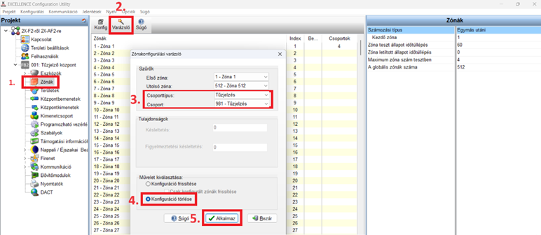 Az alábbi információs ablak jelenik meg: miden zóna esetében ki kell törölni az ÁTJ (971) / TŰZ (981) kimenetcsoport funkciót.